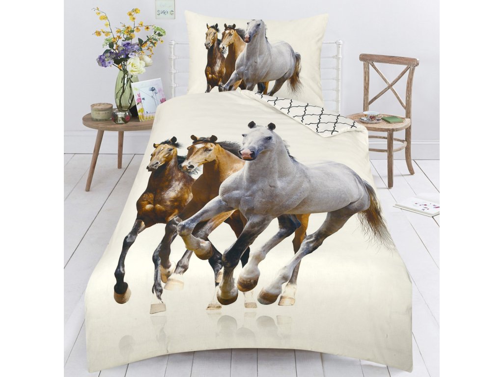 Kvalitní bavlněné povlečení na jednolůžko s romantickým vzorem běžících koní. Povlečení je vyrobeno ze 100% bavlny. Je velmi příjemné na dotek, spolehlivě vás zahřeje a výborně absorbuje vlhkost, což oceníte především v letních měsících. Vysoká kvalita zpracování zajišťuje stálost barev a rozměru.