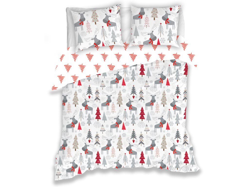 Lícní strana povlaku přikrývky je bílé barvy, poseta stromečky v šedých a červených barvách, mezi nimiž stojí sobi s červenou mašlí kolem krku a padají na ně sněhové vločky