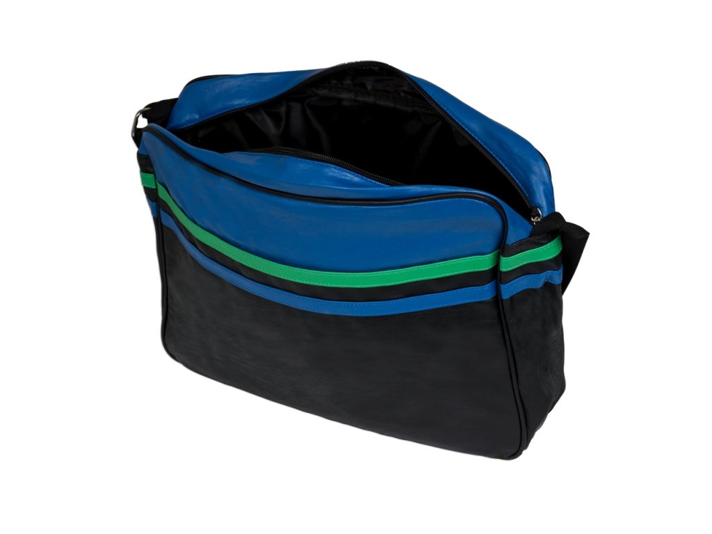 Stylová pánská taška přes rameno je vyrobena z pevného materiálu. Tato modro černá taška přes rameno doplněná zeleným a modrým pruhem je praktická taška, do které se vejde to nejdůležitější (mobilní telefon, peněženka, klíče) plus nějaké ty drobnosti. Má jeden hlavní úložný prostor se zapínáním na zip a jednu zevní kapsu bez zipu. Taška se pohodlně nosí díky nastavitelnému popruhu. Bude vašim dobrým společníkem při cestě do města nebo na výlet. Rozměry tašky jsou 39x29x11 cm.Doplňkové parametry