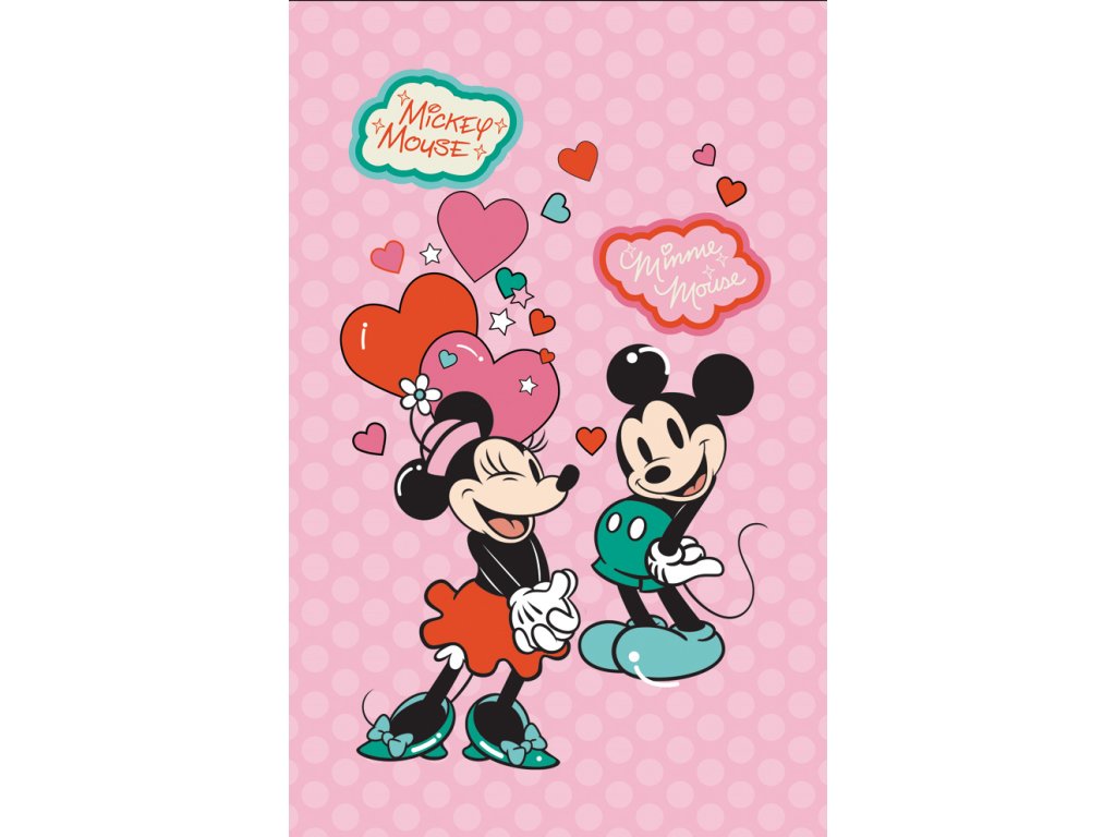 Na puntíkatém froté ručníčku na růžovém podkladu jsou zamilovaní myška Minnie a myšák Mickey. Navzájem po sobě pokukují a roztomile se před sebou stydí.
